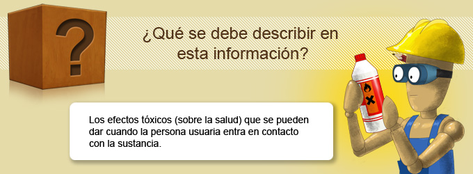 • Se dará una descripción concisa, aunque completa y comprensible, de los diferentes efectos tóxicos (sobre la salud) que se pueden dar cuando la persona usuaria entra en contacto con la sustancia o el preparado.