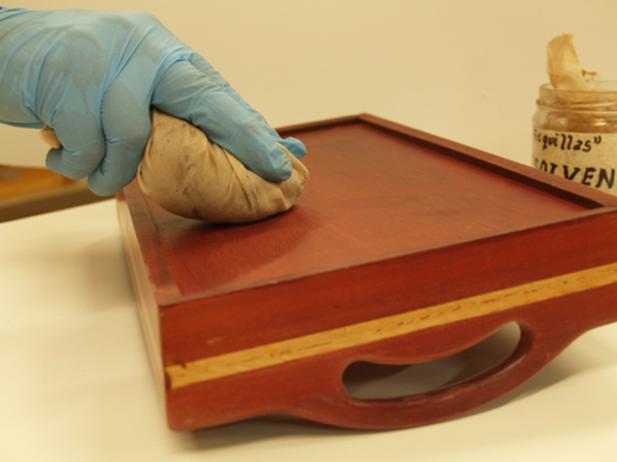 A continuación, se aplica el color sobre la superficie realizando pasadas en línea recta. Se sigue el sentido de la veta y se mantiene una presión uniforme.