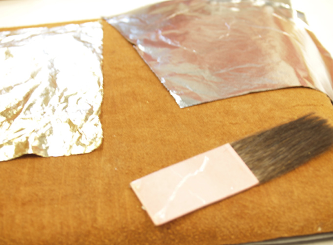 Se pone el cuadernillo de hojas de oro sobre el cojín y con la ayuda del cuchillo se deslizará una hoja sobre el pomazón. Se puede soplar suavemente sobre ella para colocarla bien. Con la hoja extendida sobre el pomazón, se procede a cortarla en cuadrados más pequeños y adecuados al sitio a cubrir.